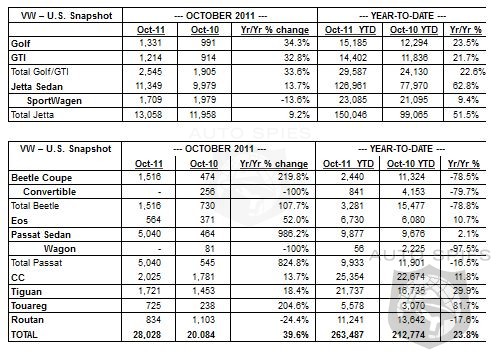 Volkswagen of America, Inc. today reported 28,028 units sold in October 2011, a 39.6 percent increase over prior year sales. Year-to-date sales are up 23.8 percent. "As the all-new Passat and Beetle start to enter the market place, demand for Volkswagen vehicles has already exceeded last year's annual volume in the first 10 months of the year, " said Jonathan Browning, President and CEO, Volkswagen Group of America, Inc. "With the right products in the heart of key segments, and now the most Insurance Institute for Highway Safety's (IIHS) TOP SAFETY PICKS in the industry, our momentum continues as customers are increasingly recognizing and embracing the quality and value of our vehicles."