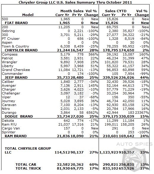 Chrysler Group LLC today reported U.S. sales of 114,512, a 27 percent increase compared with sales in October 2010 (90,137 units), and the best October sales since 2007.