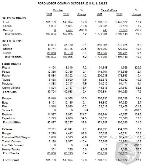 Continued strong demand for Ford’s fuel-efficient utility vehicles and trucks lifted the company to a 6 percent increase in total sales in October. With total sales of 167,803 vehicles, gains came largely from Ford brand utilities, up 38 percent, and strong truck sales, up 8 percent versus last year.