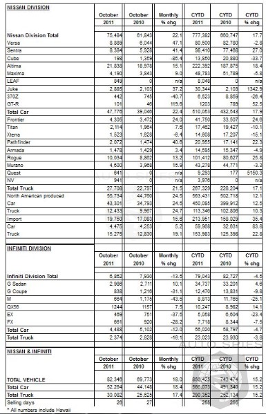 NOTE: To ensure consistency in global sales reporting, Nissan North America calculates monthly variances on a straight-percentage basis, unadjusted for the number of selling days. October 2011 had 26 selling days, while October 2010 had 27 selling days.