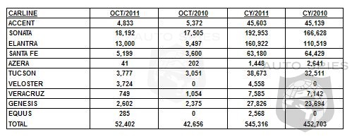 Hyundai Motor America today announced sales of 52,402 vehicles in October, a 23 percent total sales increase compared with the same period a year ago. The year-to-date sales figures of 545,316 shattered the full year sales record of 538,228 set in 2010. Retail sales were up 27 percent over last October. "Breaking our all-time any-time sales record set in 2010, with two months left in the 2011 calendar year, is an accomplishment we take great pride in and is clearly indicative of consumer acceptance of our bold line-up of award winning products," said Dave Zuchowski, Hyundai Motor America's executive vice president of national sales. "The overall sales environment appears to be stabilizing, despite continued fluctuations in traditional economic indicators, and we believe those market dynamics position Hyundai well to finish the year on a strong note."