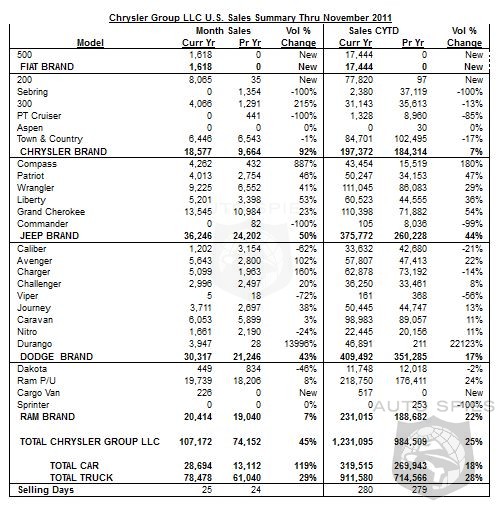 Chrysler Group LLC today reported U.S. sales of 107,172, a 45 percent increase compared with sales in November 2010 (74,152 units), and the best year-over-year sales gain this year.