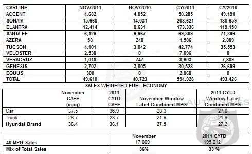 Year to date, Hyundai sales are up 21 percent versus 2010 in total, with sales to retail customers up 30 percent. Sales to fleet accounts represent 11 percent of the total sales year-to-date and 10 percent for the month of November. Thirty-six percent of Hyundai vehicles sold in November achieved 40 MPG fuel economy ratings.