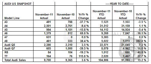 Audi today reported its 11th straight record-setting month of sales for the year with 9,700 vehicles sold in November 2011, a 3.6% increase over the previous all-time record set a year earlier. Year-to-date sales ended the month up 15.2% with 104,906 vehicles sold, topping the previous annual U.S. sales record of 101,629 set at the end of last year. "Having achieved our all-time sales record with a month to spare, we're confident that the Audi momentum story will continue well into 2012," said Audi of America President Johan de Nysschen. "Consumers clearly are responding to Audi's superior product, unmatched engineering and progressive luxury positioning."