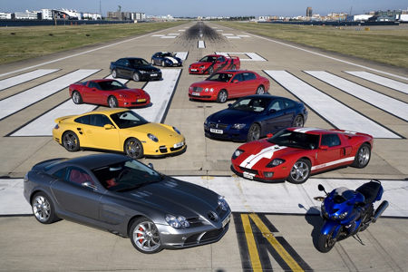 Weekly British automotive mag Autocar recently shut down the London City Airport because they wanted to find out what car was the fastest in London. Amidst a field that included hometown hero Bentley's Continental Flying Spur, as well as a Ford GT (it lost to the British-built SLR by nary 1.4 mph, fix!), Corvette Z06, Shelby Daytona Cobra, Porsche 911 Turbo, BMW M6, Alpina B5, and Vauxhall Maloo, the SLR McLaren was able to post the fastest time of 175.7 mph on the one-mile long airport runway. No word on how fast the bike in picture went, though.