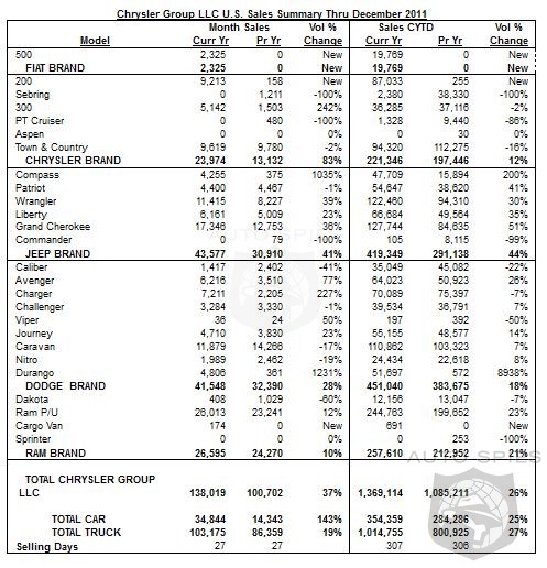 Chrysler Group LLC today reported U.S. sales of 138,019, a 37 percent increase compared with sales in December 2010 (100,702 units), the group's best monthly sales since May 2008.