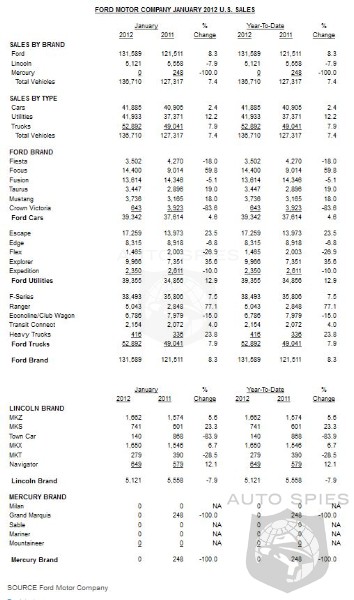 Ford Motor Company U.S. sales totaled 136,710 vehicles in January, a 7 percent increase versus year-old levels. The Ford brand totaled 131,589 vehicles in January, making it the best January sales month for the Ford brand since 2008.