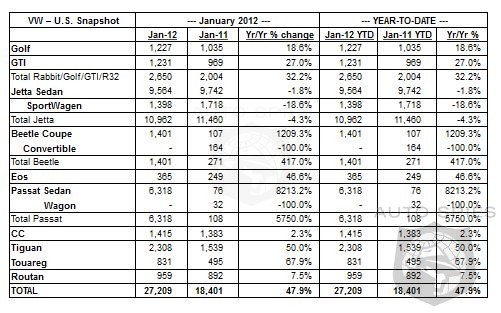 Volkswagen of America, Inc. (VWoA) today reported 27,209 units sold in January, a 47.9 percent increase over prior year sales. "We ended 2011 strong and are seeing the momentum continue into 2012 with a 47.9 percent increase, demonstrating our growth strategy continues to take root," said Jonathan Browning, President and CEO, Volkswagen Group of America, Inc. "With the today's release of our much-anticipated Game Day ad, 'The Dog Strikes Back,' our relentless focus on the core pillars of the business, and a full line-up of new and refreshed vehicles, Volkswagen is off to a strong start in 2012."
