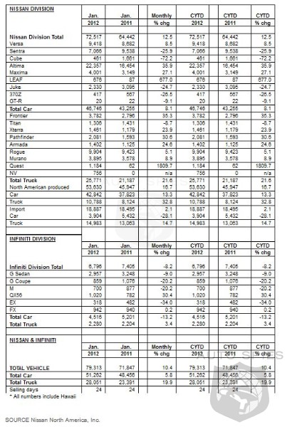 NOTE: To ensure consistency in global sales reporting, Nissan North America calculates monthly variances on a straight-percentage basis, unadjusted for the number of selling days. January 2012 had 24 selling days, as did January 2011.