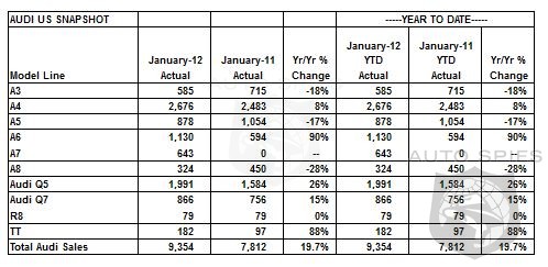 - For the record-setting month of January 2012, four Audi models recorded year-over-year sales increases of 15% or more, including the Audi A6, the Audi Q5, the Audi Q7, and the Audi TT model range.