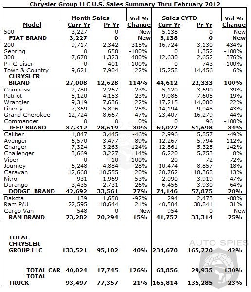 Chrysler Group LLC today reported U.S. sales of 133,521 units, a 40 percent increase compared with sales in February 2011 (95,102 units), and the group’s best February sales since 2008.