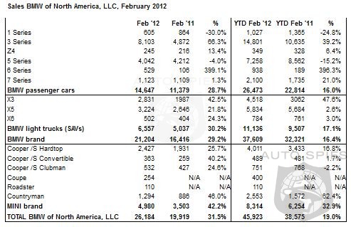 Sales of BMW brand vehicles increased 29.2 percent in February for a total of 21,204 compared to 16,416 vehicles sold in February, 2011.