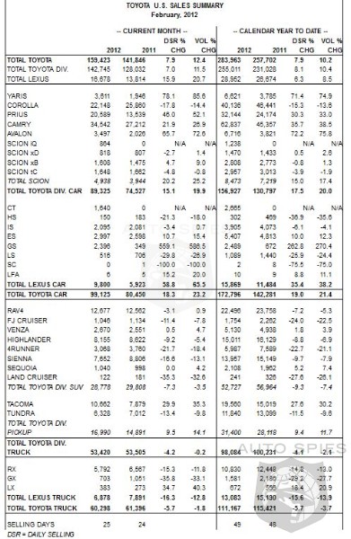 Toyota Motor Sales (TMS), U.S.A., Inc. reported monthly sales results of 159,423 units in February. With 25 selling days in 2012—versus 24 selling days in February 2011—sales increased 7.9 percent over the year-ago month on a daily selling rate basis (DSR) and 12.4 percent on an unadjusted raw volume basis. Led by sales of the all-new 2012 Camry and Camry Hybrid and the Prius family, the Toyota Division recorded February sales of 142,745 units, an increase of 7.0 percent over a year ago. The Lexus Division reported sales of 16,678 units, up 15.9 percent over last February.
