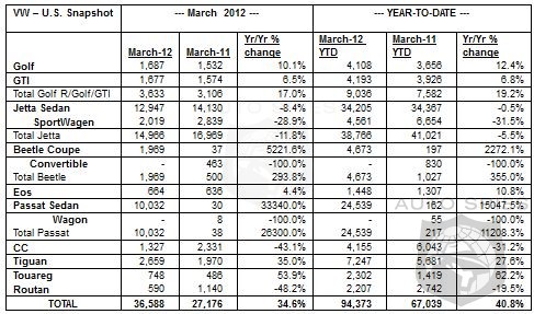 "March's strong sales of 36,588 units highlights a robust first quarter for 2012 for Volkswagen and we are poised for continued growth this calendar year," said Jonathan Browning, President and CEO, Volkswagen Group of America, Inc. "Two years ago, we sold 10,168 Passat sedans for the year, and now we've broken the 10,000 barrier for the month! The new Passat has become a true success story, and it's having a great impact across our company here in the US."