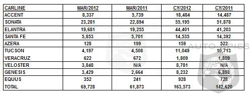 Hyundai Motor America, the most fuel efficient automaker in the U.S., today announced an all-time monthly sales record of 69,728 units, up 13 percent over last March, which held the previous record. For the first quarter, Hyundai sales were up 15 percent over 2011. "March was the best month in Hyundai's history and capped the best first quarter we've ever recorded," said Dave Zuchowski, Hyundai Motor America's executive vice president of national sales. "Improving vehicle availability, particularly among our most fuel-efficient vehicles, Sonata, Elantra, Accent and Veloster, has fueled this record growth."
