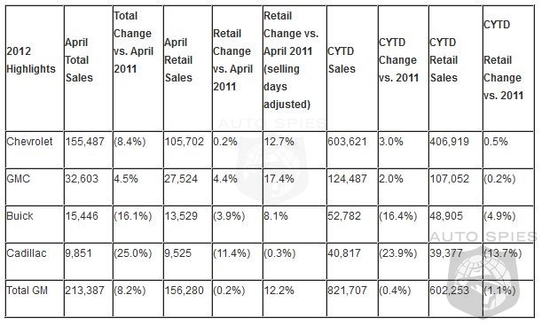 On a selling-day adjusted basis, GM total sales were up 3 percent and retail sales were up 12 percent. On the same basis, Chevrolet retail sales were up 13 percent, Buick retail sales were up 8 percent, GMC retail sales were up 17 percent and Cadillac retail sales were essentially equal to a year ago. There were three fewer selling days in April 2012 than a year ago.