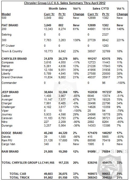 Chrysler Group LLC today reported U.S. sales of 141,165 units, a 20 percent increase compared with sales in April 2011 (117,225 units), and the group’s best sales in the month of April since 2008.