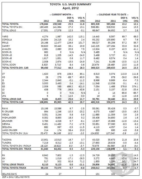 Toyota Motor Sales (TMS), U.S.A., Inc., today reported sales of 178,044 units, an increase of 25.5 percent compared to April 2011 on a daily selling rate (DSR) basis. Unadjusted for 24 selling days in April 2012 versus 27 selling days in April 2011, TMS sales were up 11.6 percent over the year-ago month on a raw volume basis.