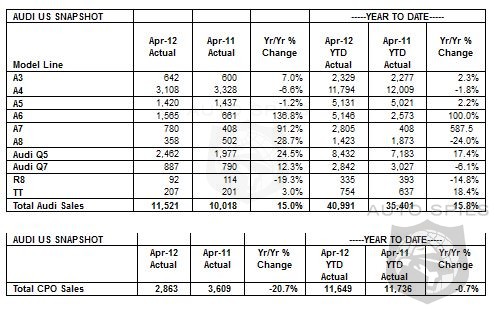 - For the record-setting month of April 2012, three Audi models recorded year-over-year sales increases of 20% or more, including the Audi A6, the Audi A7, and the Audi Q5 models.