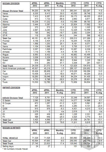 NOTE: To ensure consistency in global sales reporting, Nissan North America calculates monthly variances on a straight-percentage basis, unadjusted for the number of selling days. April 2012 had 24 selling days, while April 2011 had 27 selling days.