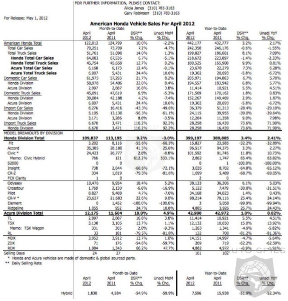 American Honda today reported April 2012 U.S. sales of 122,012 units, an increase of 10 percent based on the daily selling rate*. The Honda division posted April 2012 sales of 109,837, an increase of 9.2 percent compared to April 2011. Acura's U.S. April sales of 12,175 were up 18 percent compared to April 2011.