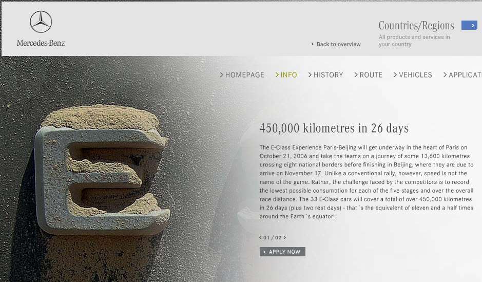 Between July 21st and August 20th, candidates from all over the world may apply for a place behind the steering wheel. For each stage, two participants form a team taking turns in driving the E 320 CDI. The “E-Class Experience” will challenge both the vehicles and the drivers with the highest demands. Amongst the minimum requirements for the participation are a valid driving licence and passport, physical fitness and a good command of English. Another criteria is an individual text in which the candidates explain their personal motivation for their application. The details of the application procedure as well as comprehensive information on the individual stages can be found on the website.