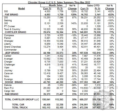 Chrysler Group LLC today reported U.S. sales of 150,041 units, a 30 percent increase compared with sales in May 2011 (115,363 units), and the group's best sales in the month of May since 2007.