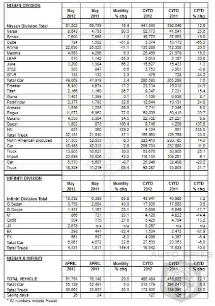 NOTE: To ensure consistency in global sales reporting, Nissan North America calculates monthly variances on a straight-percentage basis, unadjusted for the number of selling days. May 2012 had 26 selling days, while May 2011 had 24 selling days.