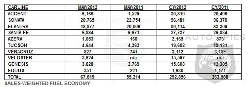 Hyundai Motor America, the most fuel-efficient automaker in the U.S., today announced an all-time May sales record of 67,019 units, up more than 13 percent over last year's all-time May record, and the second best sales month in company history. "The industry experienced choppier waters than anticipated in May," said Dave Zuchowski, executive vice president of sales. "While industry demand and traffic remained strong, consumer confidence was clearly conflicted with a recovering market being hedged against the inherent uncertainties of a looming presidential election and some disappointing housing and unemployment news. Amidst this economic backdrop and our own very low inventories, we felt great about setting yet another monthly volume record and are really well positioned for what we fully expect to be a robust summer sales period."
