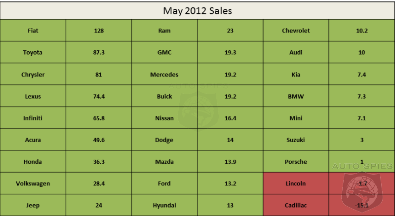 With supplies issues essentially behind them Toyota and Honda were able to post incredible sales increases compared to their May 2011 figures and even surpassing 2010 figures by a significant margin as well. Elsewhere the Chrysler Group continued its strong sales increase of the past year with surging sales at Chrysler itself, Jeep, and Ram brand. On the luxury side Lexus and Acura followed their parent brands with sales returning to previous levels while Mercedes achieved a nearly 20% sales improvement over last year. Overall May 2012 versus May 2011 sales were robust whichever way you look at it with only a couple of brands declining over a year ago. Of note was the Chevy Volt's strong month of 1,680 sales compared to the LEAF's showing of 510.
