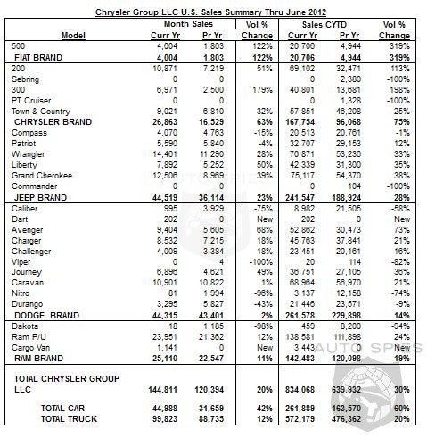 The FIAT brand set a sales record for the fifth-consecutive month and the brand's 122 percent year-over-year sales gain was the largest percentage increase of any Chrysler Group brand in June. More Fiat 500 vehicles were sold during the first six months of this year than during all of 2011.