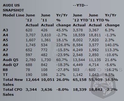 - For the record-setting month of June 2012, four Audi models recorded year-over-year sales increases of 20% or more, including the Audi A3, the Audi A6, the Audi A8, and the Audi Q5 models.