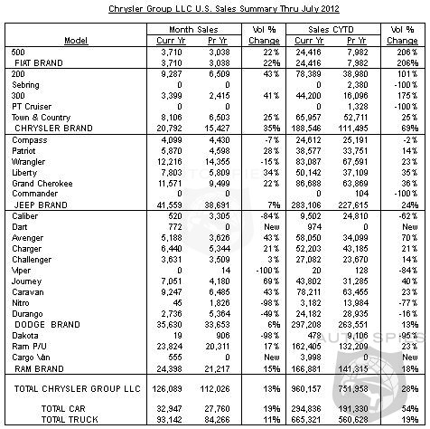 Chrysler Group LLC today reported U.S. sales of 126,089 units, a 13 percent increase compared with sales in July 2011 (112,026 units), and the group's best July sales since 2007.