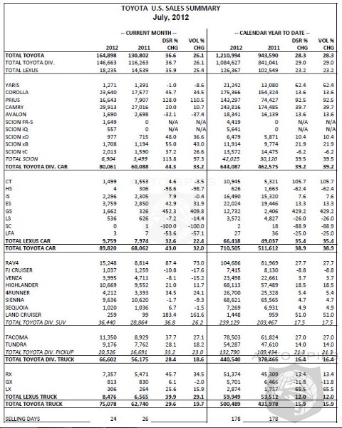 Toyota Motor Sales, U.S.A., Inc., today reported July 2012 sales results of 164,898 units, an increase of 36.6 percent compared to the same period last year on a daily selling rate (DSR) basis. On a raw volume basis, unadjusted for 24 selling days in July 2012 compared to 26 selling days in July 2011, TMS sales were up 26.1 percent from the year-ago month.