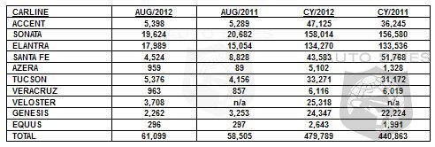 Hyundai Motor America announced an all-time August sales record of 61,099 units, a four percent increase compared with the same period a year ago and the best August sales level in company history, even topping the Cash for Clunkers mark set in 2009. "We feel really good about the way August shaped up as our overall inventory situation continued to improve and consumer response to the all-new Santa Fe has been nothing short of remarkable," said Dave Zuchowski, executive vice president of sales.