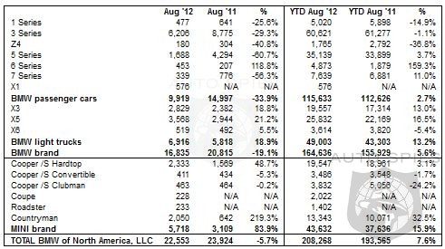The BMW Group in the U.S. (BMW and MINI combined) reported August sales of 22,553 vehicles, a decrease of 5.7 percent from the 23,924 vehicles sold in the same month a year ago. Year-to-date, BMW Group is up 7.6 percent on sales of 208,268 in the first eight months of 2012 compared to 193,565 in the same period in 2011. "August numbers showed how tight the supply of new vehicles has been for us but the eagerly awaited new models, the X1 and 3 Series AWD in particular, are arriving and that's great news for our customers and our dealers," said Ludwig Willisch, President and CEO, BMW of North America, LLC. "All indicators show sales momentum increasing and with the model year change now complete, we have ambitious plans for the months ahead."