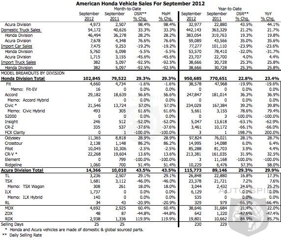 American Honda today reported September 2012 U.S. sales of 117,211 units, an increase of 30.9 percent compared with September 2011. The Honda Division posted September 2012 sales of 102,845 units, an increase of 29.3 percent compared with September 2011. Acura's U.S. September sales of 14,366 units increased 43.5 percent compared with September 2011.