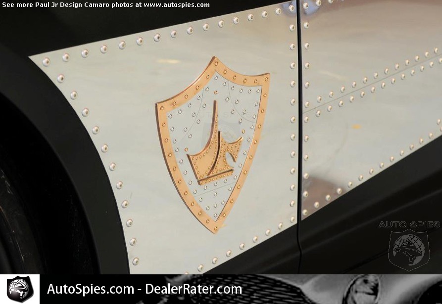 It features a bunch of goodies, like a coil over suspension, Hurst shifter, a Whipple supercharger, 22-inch wheels, a matte black paint job and, interestingly, custom sheet metal paneling with rivets and copper accents.