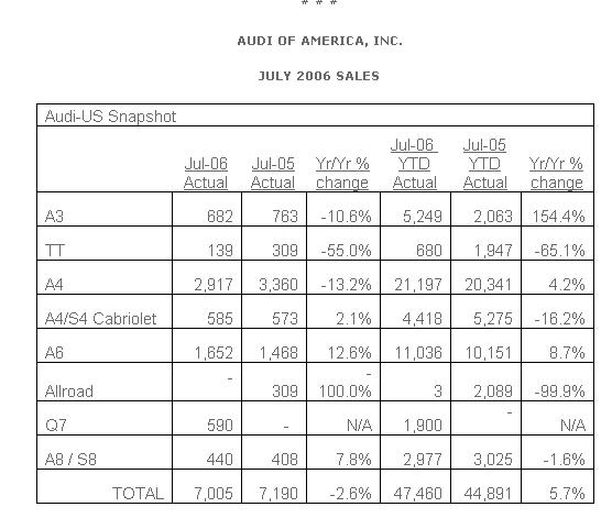 AUBURN HILLS, Mich.- Audi of America, Inc. today reported July 2006 sales of 7,005 units, down just 1.5 percent compared to year ago sales, as the company is experiencing its lowest vehicle inventories in several years. Sales through the first seven months of 2006 remain on a record pace; Audi dealers have sold 47,460 vehicles this year.