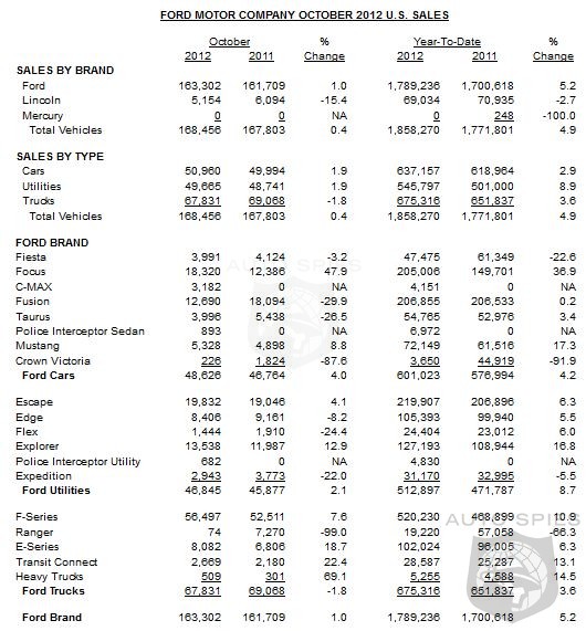 Ford total U.S. sales grew across the portfolio in October, with cars up 2 percent, utilities up 2 percent, F-Series pickups up 8 percent and Econoline and Transit Connect sales up 19 and 22 percent, respectively.