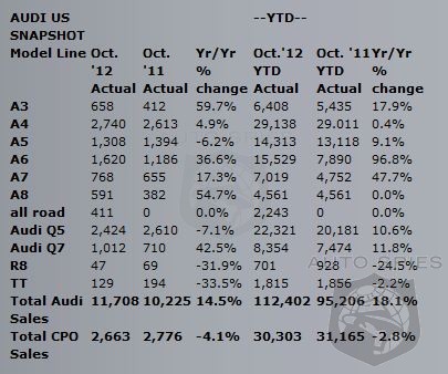 • For the record-setting month of October 2012, five Audi models recorded year-over-year sales increases of 20% or more, including the Audi A3, the Audi A4, the Audi A8 and the Q7 models.