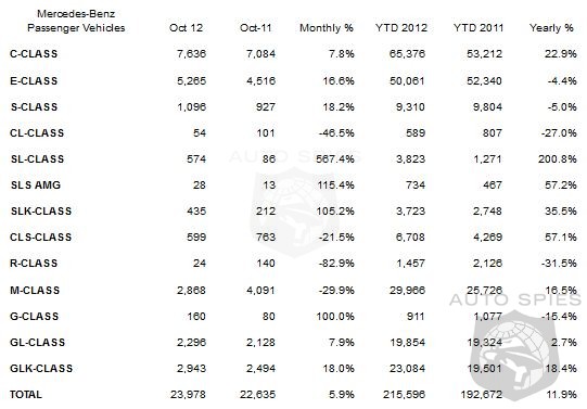Mercedes-Benz USA (MBUSA) today reported record October sales of 23,978 for its Mercedes-Benz models, up 5.9%, delivering a record year-to-date total of 215,596 new vehicles to customers, up 11.9%. Combined sales of Mercedes-Benz passenger vehicles, smart and Sprinter for the month totaled a record for MBUSA overall with sales of 26,642, up 9.0%, bringing the year-to-date total to 240,973 up 15.8%.