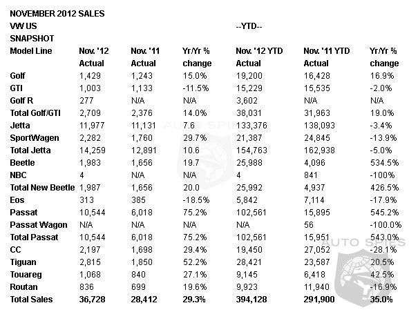 Volkswagen of America, Inc. today reported 36,728 units delivered in November, a 29.3 percent increase over prior year sales, a 35 percent year-to-date increase and the best November since 1973.