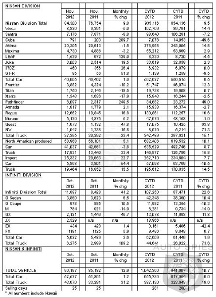 NOTE: To ensure consistency in global sales reporting, Nissan North America calculates monthly variances on a straight-percentage basis, unadjusted for the number of selling days. November had 25 selling days both in 2012 and 2011.