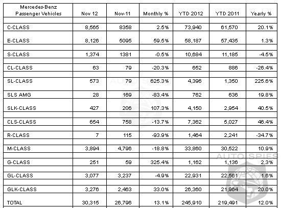 At the high end, the all-new iconic sixth generation 2013 SL roadster – which debuted in showrooms this past spring -- posted sales of 573, an increase of 625.3% over last November.
