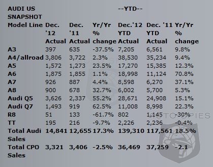 • The Audi allroad finished the month at 435 sales (in addition to two Audi A4 Avant sales), compared to 260 Audi A4 Avant sales in December 2011. For the year, allroad sales amounted to 3,115 units (in addition to 1,252 A4 Avant sales in 2012) compared to 3,505 A4 Avant sales in 2011. The Audi allroad went on sale in the summer of 2012.
