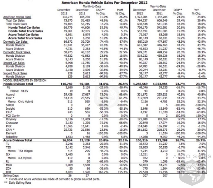 Buoyed by strong December 2012 U.S. sales of 132,774 units, an increase of 26.2 percent compared with December 2011, American Honda posted annual vehicle sales of 1,422,785 units in 2012, up 24.0 percent compared with 2011. This makes 2012 American Honda's fourth-best sales year ever, and its best sales result since 2008.