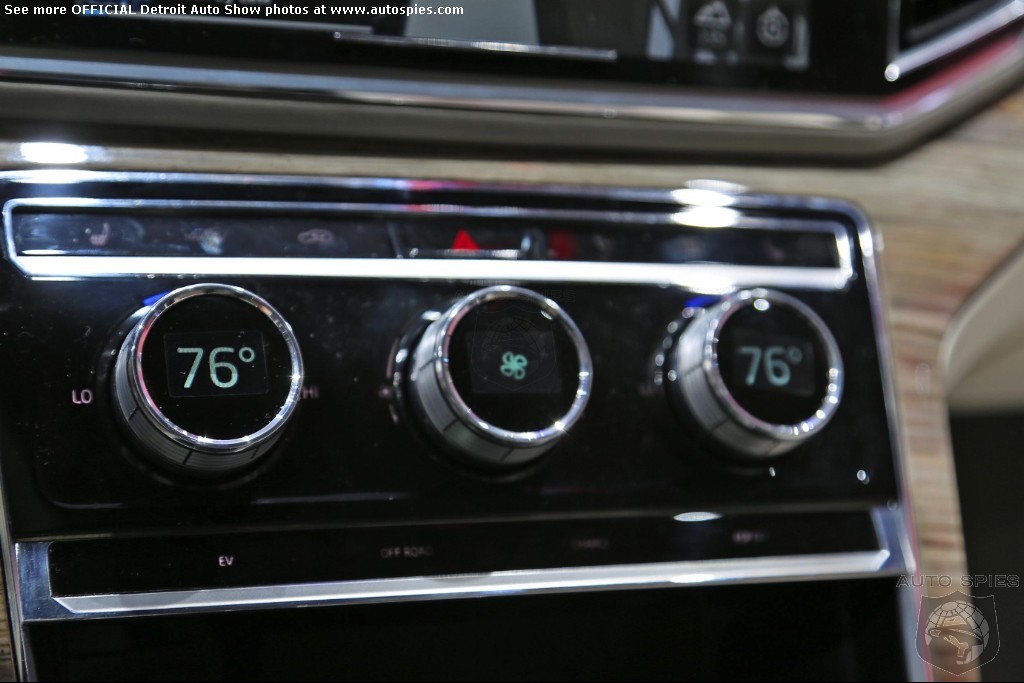 As soon as the driver starts the SUV, the round-shaped controls for the lights, climate control, and the four-wheel-drive system emerge from their flush resting positions. The controls have rugged aluminum surrounds: aluminum is one of the predominant materials in the interior and is used for the air vent surrounds and the array of switches as well as for such features as the steering wheel spokes.