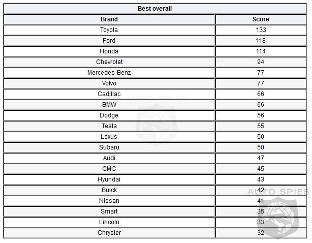 Combining those factors gives Consumer Reports the total brand-perception score. "This past year brought stability and increased sales to much of the automotive industry.