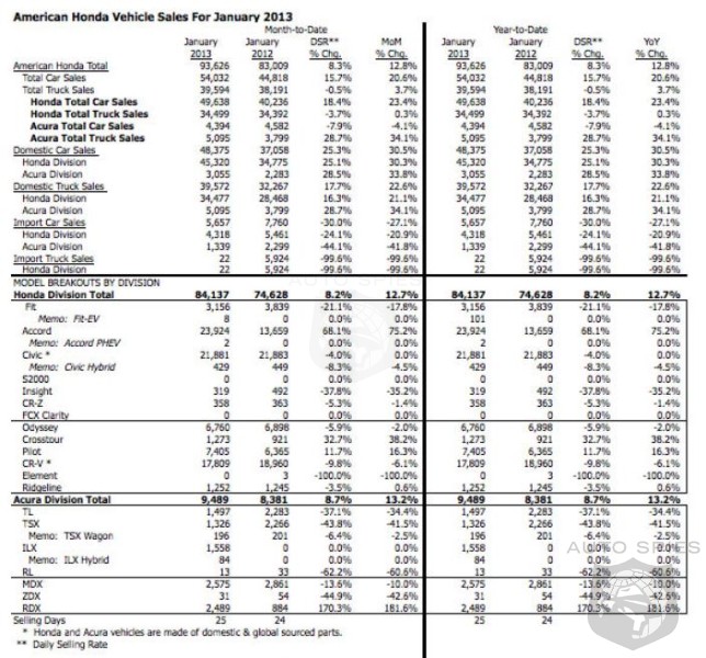 American Honda today reported January 2013 U.S. sales of 93,626 units, an increase of 12.8 percent compared with January 2012. The Honda brand posted January 2013 sales of 84,137 units, an increase of 12.7 percent compared with January 2012. Acura U.S. January sales of 9,489 units increased 13.2 percent compared with January 2012.